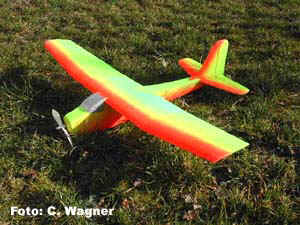 "Anbei ein Photo unseres Flexifly Samurai, mit Brushless-Antrieb und 8-Zellen NiMh. Bei moderatem Einsatz der Power (Akkutemperatur!) ist es eine Wonne das kleine Kraftpacket zu fliegen."